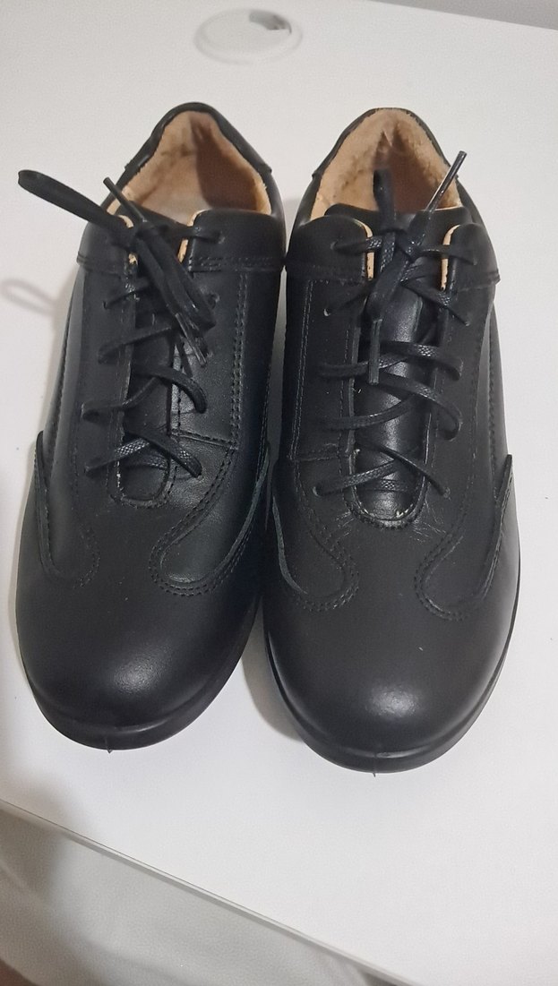 Siyah bağcıklı, lastik malzemeden yapılmış erkek çocuk özel ayakkabısı. Düz ve goth tarzında, sade görünüm için uygun.