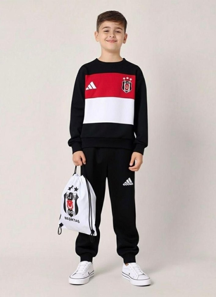 Erkek çocuklar için bol kesim, baskılı desenli siyah eşofman takımı. Yumuşak ve sıcak kumaştan, bisiklet yaka ve cırt cırt detaylı.