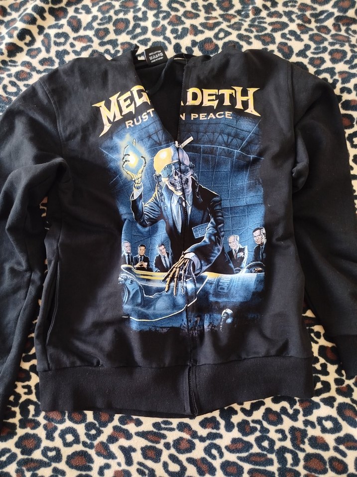 Rock punk havasında, fermuarlı siyah erkek çocuk kot ceket. Üzerinde 'MEG DETH' ve 'RUST IN PEACE' yazılı baskı bulunur.