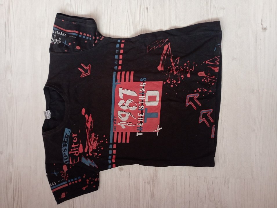 Siyah, baskılı ve dar kesim erkek çocuk tişörtü. Kısa kollu, yuvarlak yaka ve sentetik kumaştan üretilmiştir.