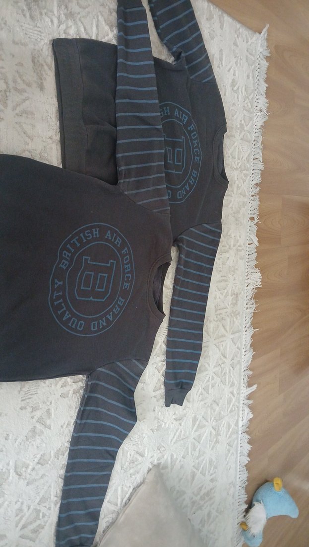 Erkek çocuk için uzun kollu, örgü detaylı çizgili kollar ve bisiklet yaka içeren, baskılı British Air Force logosu bulunan siyah ve gri tonlarında fitted sweatshirt.