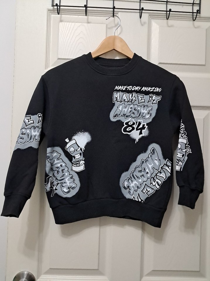 temiz sorunu yok. Siyah renkli, uzun kollu, bisiklet yaka ve bol kesim erkek çocuk sweatshirtü. Gri baskılı, rock punk tarzı ve yumuşak, sıcak kumaştan örülmüş detaylara sahiptir.