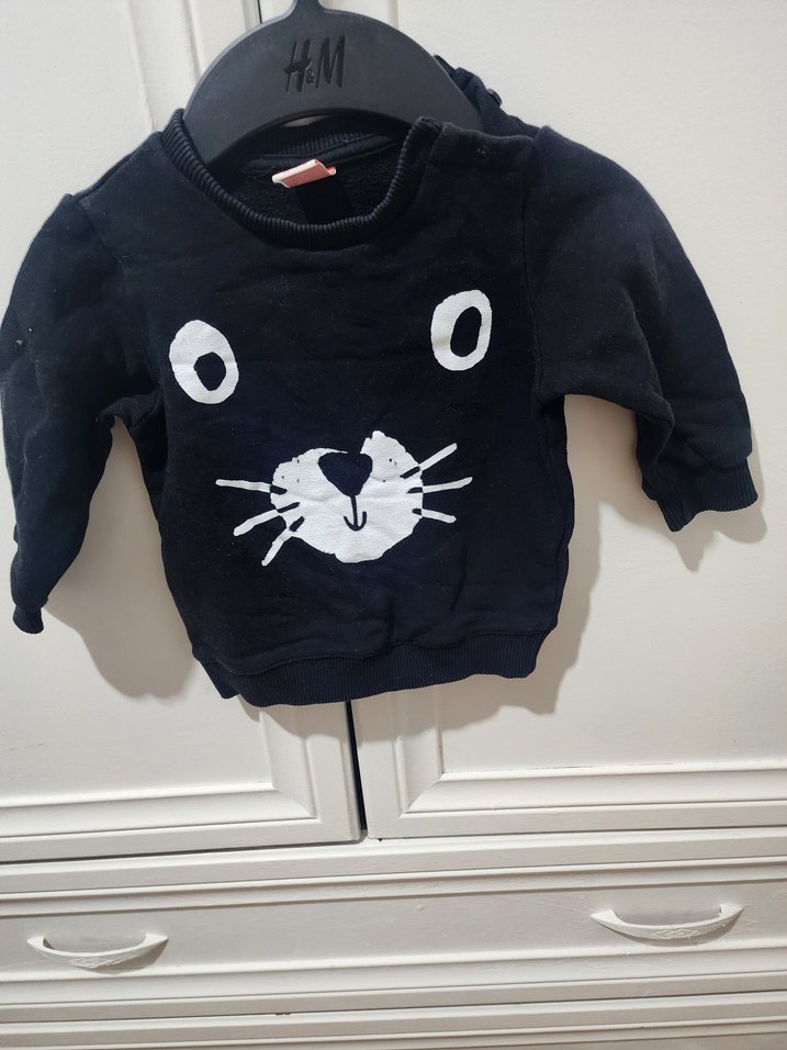 Erkek çocuklar için uzun kollu, bisiklet yaka, örgü dokulu ve önünde eğlenceli baskılı yüz deseni bulunan siyah renkli fitted sweatshirt.