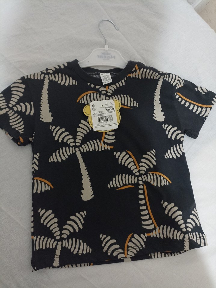 Erkek çocuk için siyah renkli, kısa kollu, yuvarlak yakalı, bol kesim tişört. Sentetik kumaştan üretilmiş ve palmiye ağacı baskısı bulunur.
