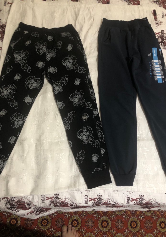 Siyah, baskılı ve düz desenli, yumuşak ve sıcak kumaştan erkek çocuk eşofman altları. Rahatlık için lastikli bel yapısına sahip.