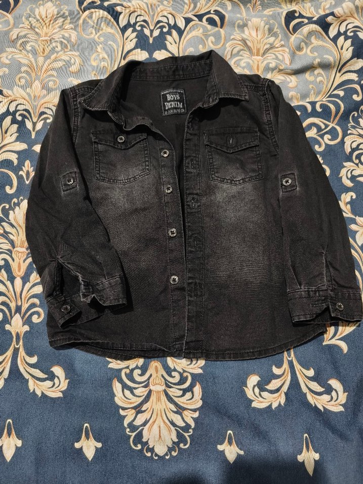 Erkek çocuk için siyah denim gömlek, uzun kollu ve düğmeli. Notlu yaka ve bol kesimiyle koyu batik desenlidir.