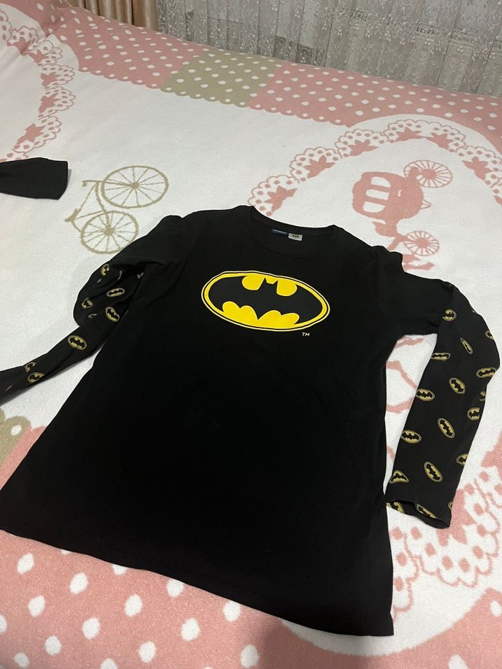 Pamuk kumaştan yapılmış, uzun kollu ve bisiklet yakalı, siyah renkli, baskılı Batman logosu ve baskılı kollara sahip, erkek çocuk tişörtü.