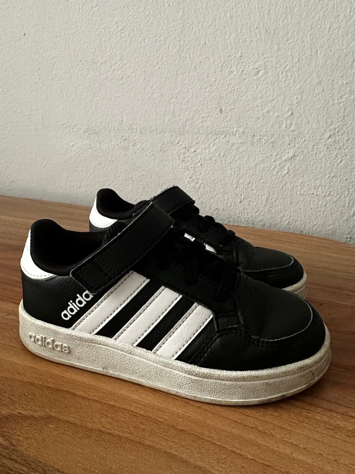 Siyah beyaz, çizgili Adidas erkek çocuk spor ayakkabısı, cırt cırtlı ve kauçuk tabanlı, sokak stili için uygundur. Temiz ve az kullanılmıştır.