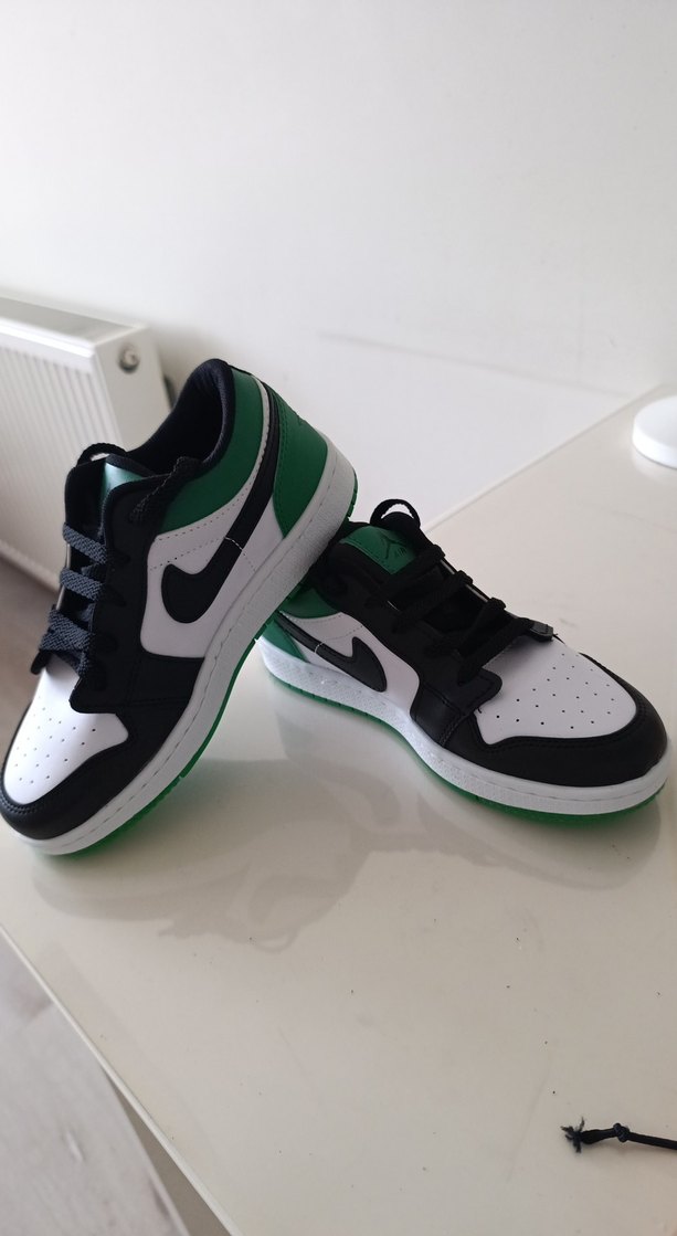 Erkek çocuklar için siyah beyaz, koyu yeşil detaylı, cırt cırtlı ve kauçuk tabanlı spor ayakkabı. Desensiz, sade tasarım. orjinal ürün değildir pazarlık payı var. hiç kullanılmadı