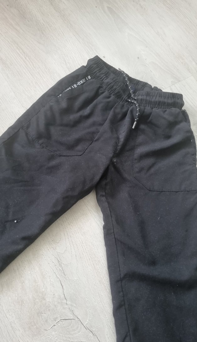 Erkek çocuklar için düğmeli ve lastikli siyah keten bol kesim pantolon, sokak modasına uygun.