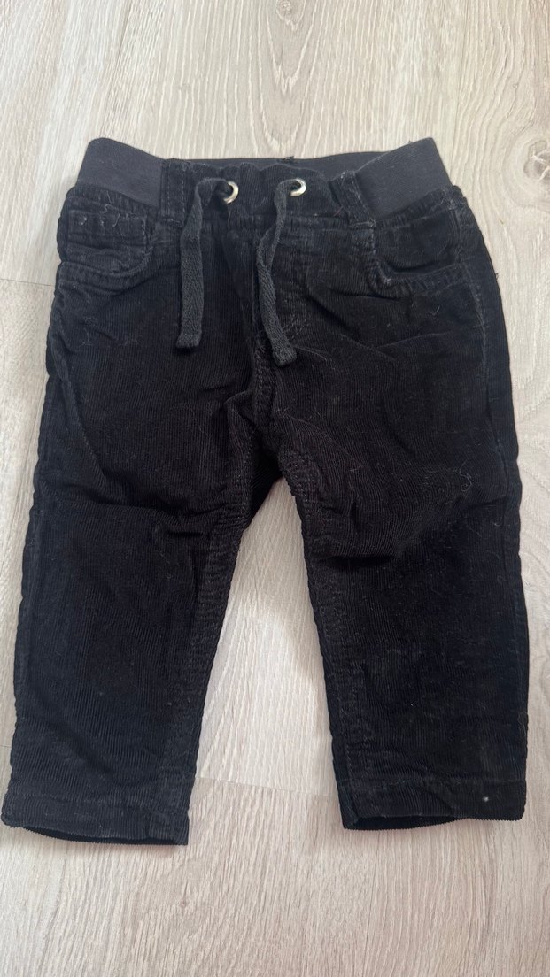 Erkek çocuk için düğmeli ve bağcıklı siyah kadife pantolon. Rahat ve trend sokak stili için uygun.