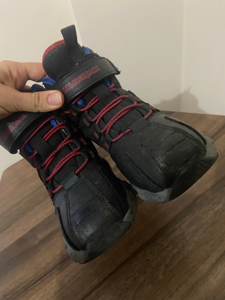 Lumbercak bot. Kauçuk malzemeden yapılmış, cırt cırtlı ve kırmızı bağcıklı siyah erkek çocuk botu, sokak modası ve rock punk tarzında.