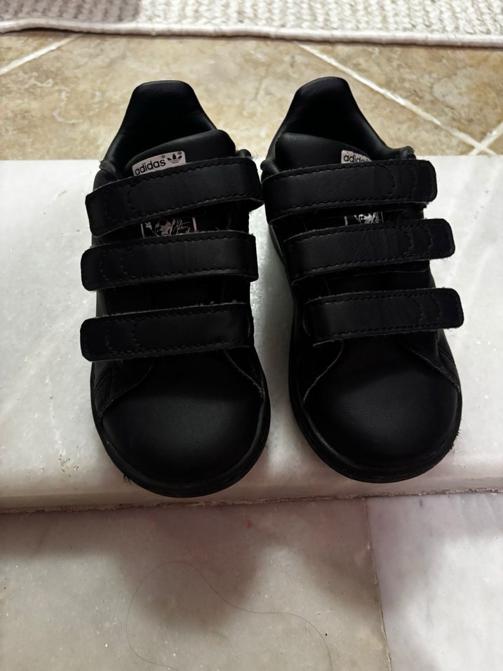 Üç cırt cırtlı, lastik tabanlı siyah erkek çocuk adidas marka spor ayakkabısı, sade ve sokak stili tasarımıyla rahat kullanım sunar.25 numara