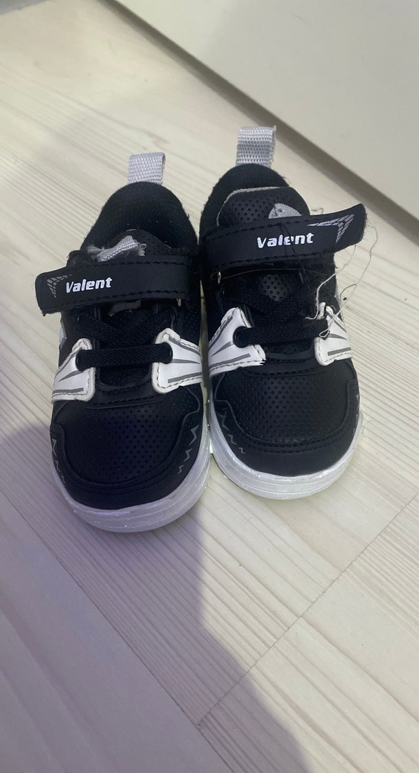 Siyah renkli, cırt cırtlı ve kauçuk tabanlı erkek çocuk spor ayakkabısı. Street wear tarzında, baskılı detaylara sahip. Marka adı Valent görünüyor.
