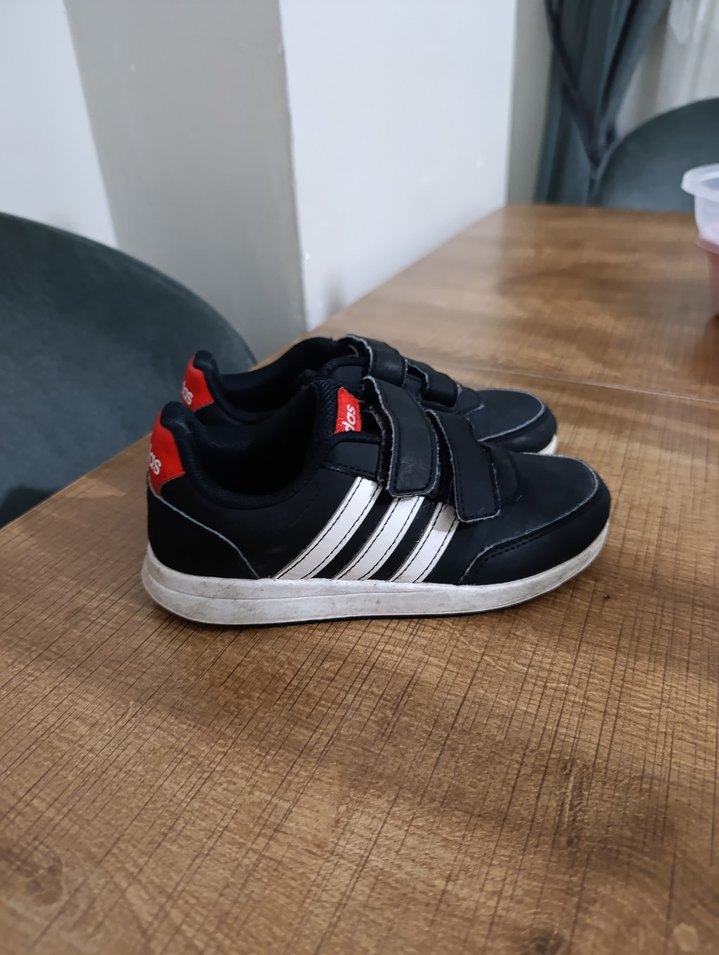 Siyah renkli, cırt cırtlı erkek çocuk spor ayakkabısı. Baskılı desenli, kauçuk tabanlı, sokak stili için uygun ve rahat. adidas orjinal