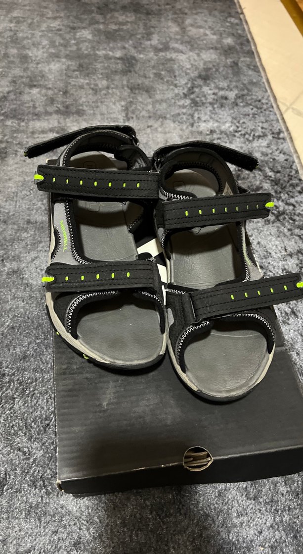 Siyah renkli, cırt cırtlı bantlı ve kauçuk tabanlı erkek çocuk spor sandaletleri.