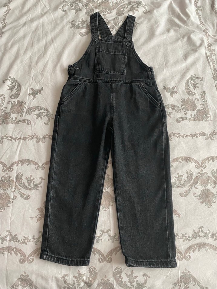 Ayarlanabilir tokalı askılara ve ön ceplere sahip, salaş kesim siyah denim erkek çocuk tulumu. Kumaşta hafif tie-dye deseni bulunur.