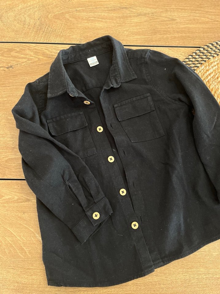Erkek çocuklar için uzun kollu, düğmeli siyah denim gömlek. Notch yaka ve cep detaylarına sahip, regular fit ve sade sokak stili.