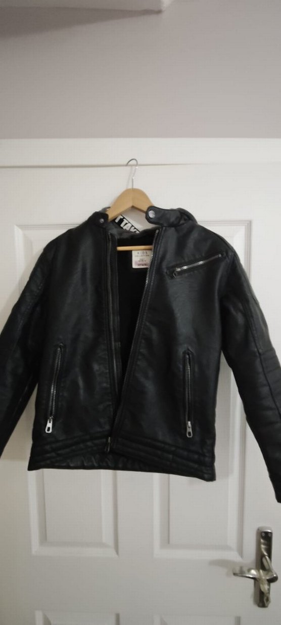 Erkek çocuklar için siyah deri biker ceket, keskin yaka ve fermuarlı ceplerle trend ve rahat bir stil sunar.