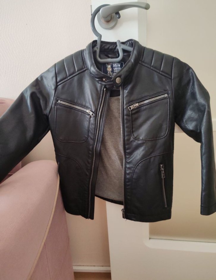 Erkek çocuk için siyah deri biker ceket, çıtçıtlı yakaya ve fermuarlı ceplere sahiptir. Rahat kesim ve trend günlük stil sunar.