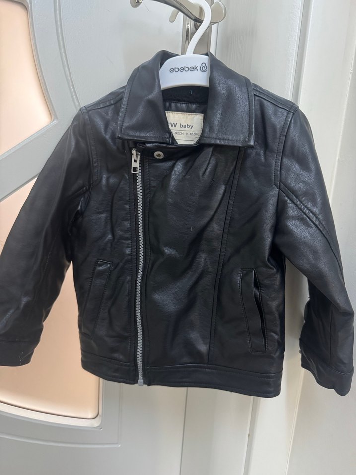 Erkek çocuklar için siyah deri biker ceket, fitted kesim, yaka kısmı notched lapel, fermuarlı ön ve ceplerle trendy casual tarz sunar.