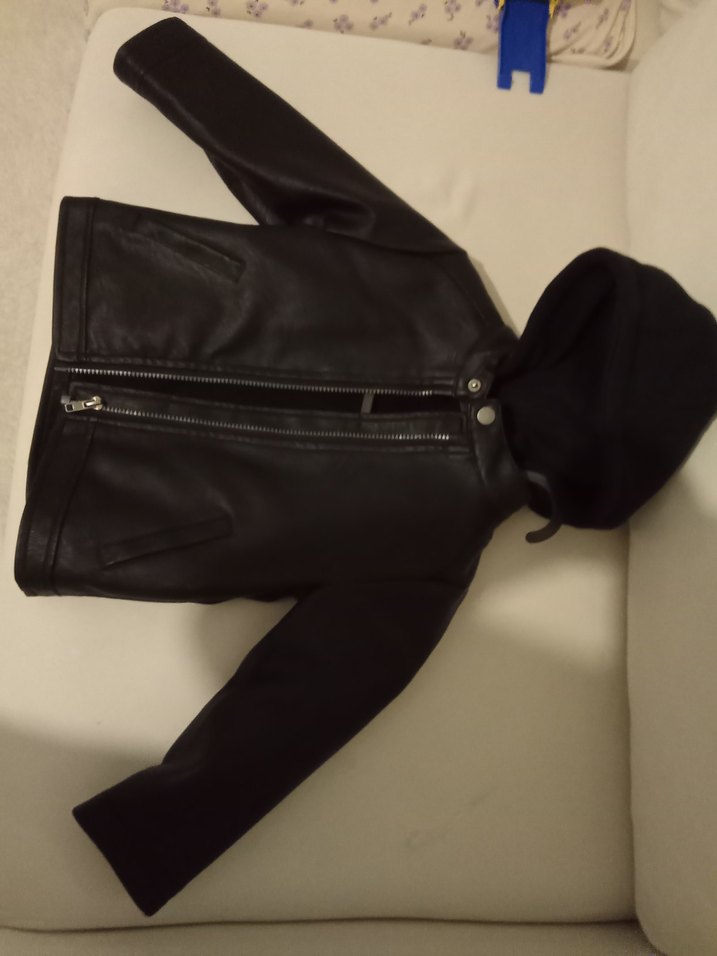 Erkek çocuk için siyah deri, biker tarzı, fermuarlı ve kesimli ceket. Yaka kısmı notched lapel şeklindedir, desensiz ve sade tasarımlıdır.