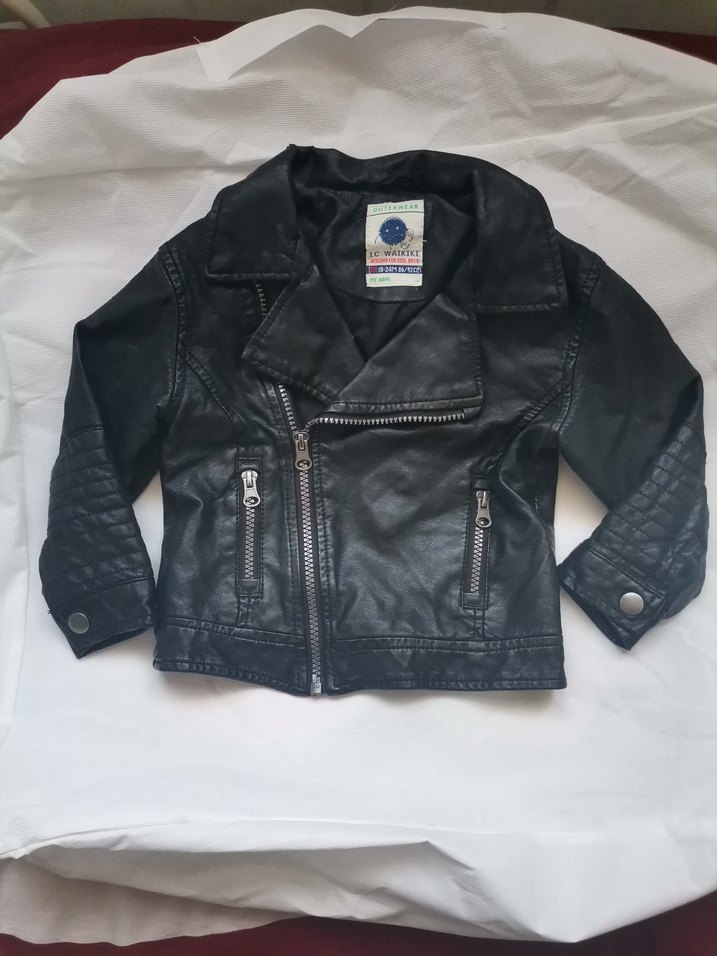 Bu erkek çocuk siyah deri biker ceket, yakalı ve fermuarlı ön ve ceplere sahiptir. Regular fit ve desensiz şık bir tasarıma sahiptir. Fermuarın altında kalan kısımda deri kalkması mevcut resimde mevcut