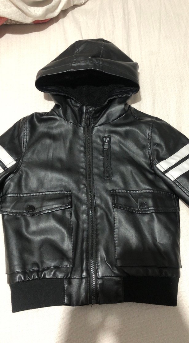 Erkek çocuk için siyah deri kapüşonlu ceket, fermuarlı ön ve iki cep detayına sahiptir. Beyaz şeritli kollarda rock punk tarzı yansır.