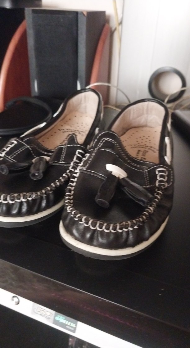 Erkek çocuklar için siyah deri tokalı loafer ayakkabılar. Düz ve klasik tasarıma sahiptir, beyaz dikiş detayları bulunur.