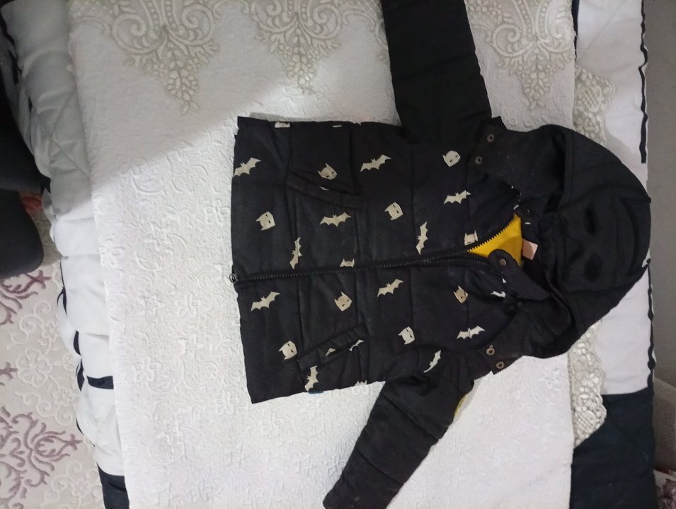 Erkek çocuklar için düğmeli, kesimli siyah mont. Yumuşak kumaştan, hayalet ve yarasa desenleriyle trend günlük stil için uygundur.