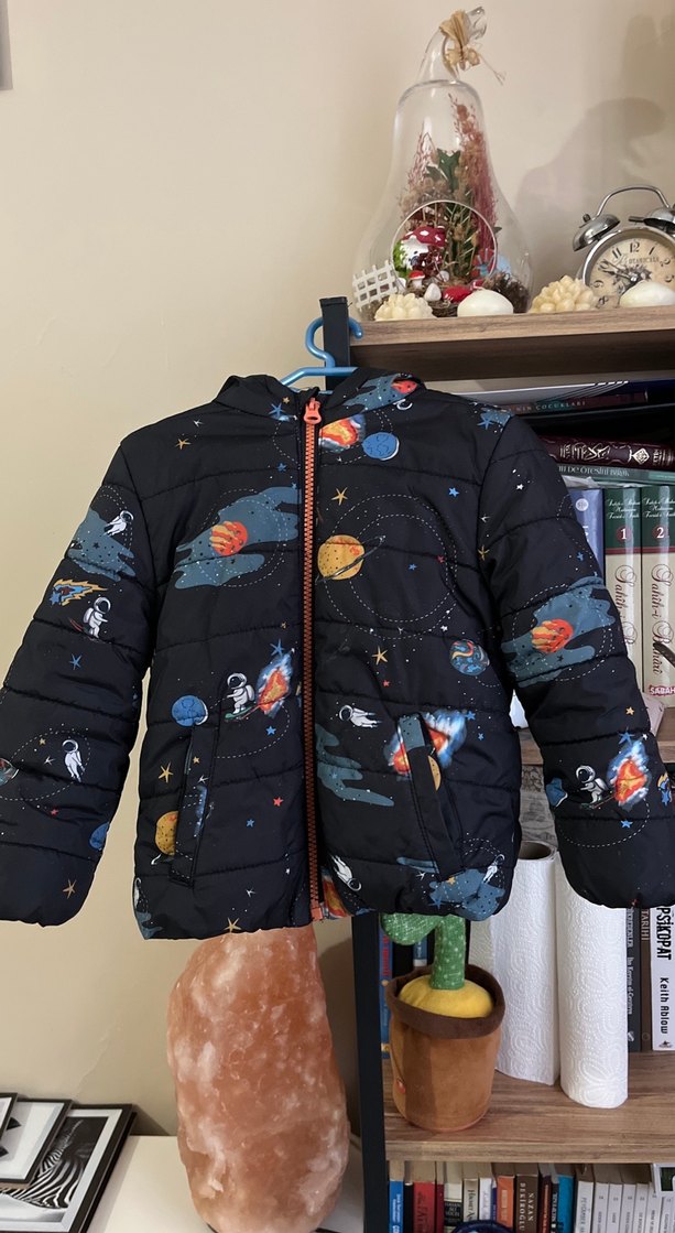 Erkek çocuklar için siyah, desenli ve , kesimi vücuda oturan mont. Notçalı yaka ve sokak modasına uygun tasarım içerir.