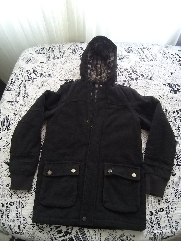 Erkek çocuklar için siyah, düğmeli ve kışkırtıcı goth tarzı kaban. Yumuşak kumaş ve yakalı, rahat kesim.biz severek kullandik sıcak tutiyordu bilegindeki lastikleri ben yaptırdım 9 yaziyor ama 10 11 e kadar giyebilir