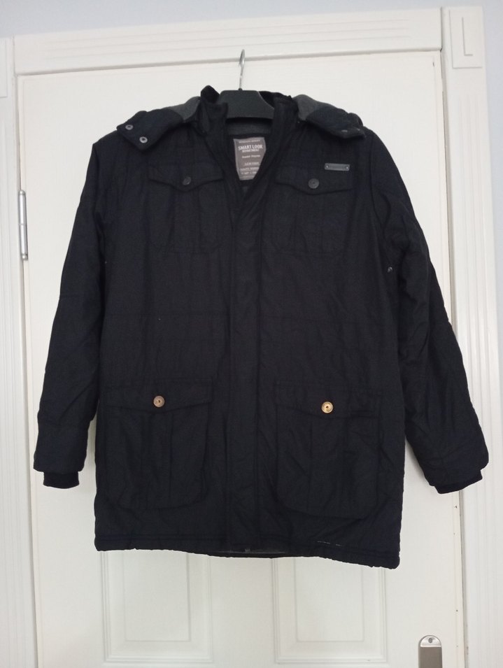 Erkek çocuklar için düğmeli, kırlangıç yaka detaylı kaban. Siyah renkte, yumuşak ve sıcak tutan kumaştan, rahat kesim.