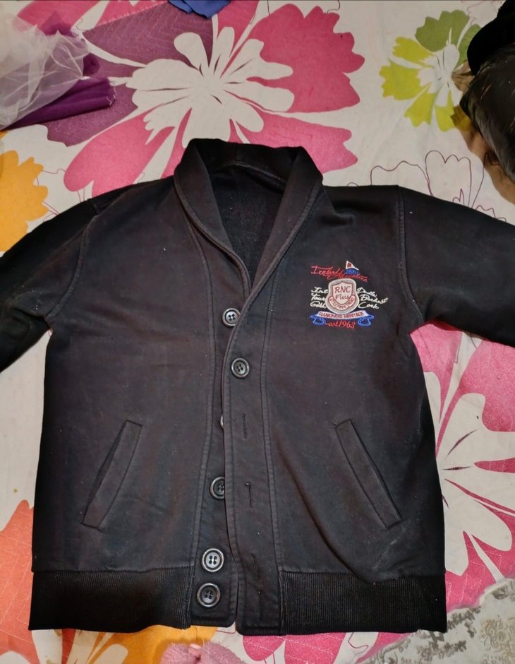 Erkek çocuklar için siyah düğmeli ceket, notched lapel yakalı ve yumuşak, sıcak materyalden üretilmiştir. Gevşek kesimi ve baskılı detayları ile trend casual tarzda uygun.