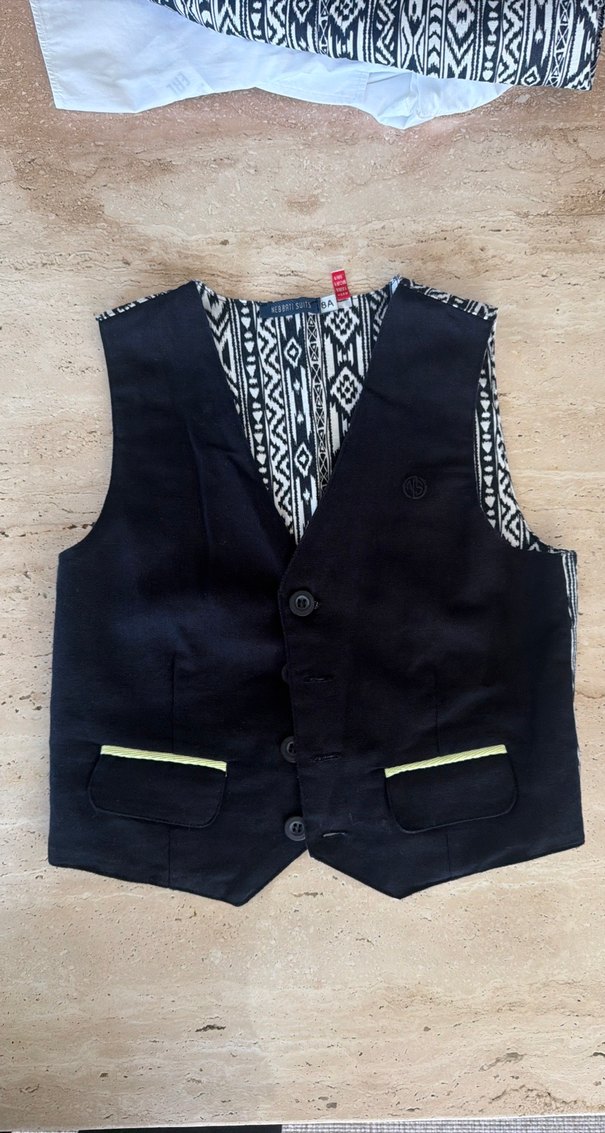 Ceket gömlek yelek papyon olarak set . Siyah renkli, düğmeli ve kolsuz erkek çocuk yeleği. Notlu yaka ve bağlamalı iç astar ile sokak stili ve rahatlığı bir arada sunar.