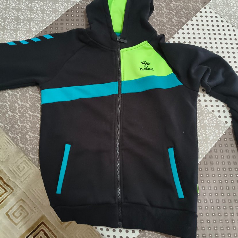 Siyah renkli, fermuarlı, bisiklet yakalı, baskılı ve fitted kesime sahip erkek çocuk sweatshirtü. Turkuaz detaylar ve cepler bulunur. Sokak stiline uygun, yumuşak ve sıcak kumaş. orjinal Hummel marka