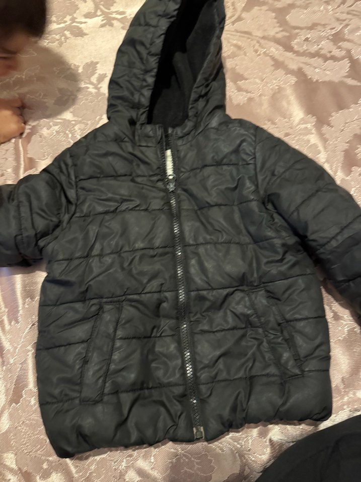 Yumuşak ve sıcak kumaştan, fermuarlı ön ve kapüşonlu, siyah renkli erkek çocuk montu, notched lapel tarzında ve dar kesim.