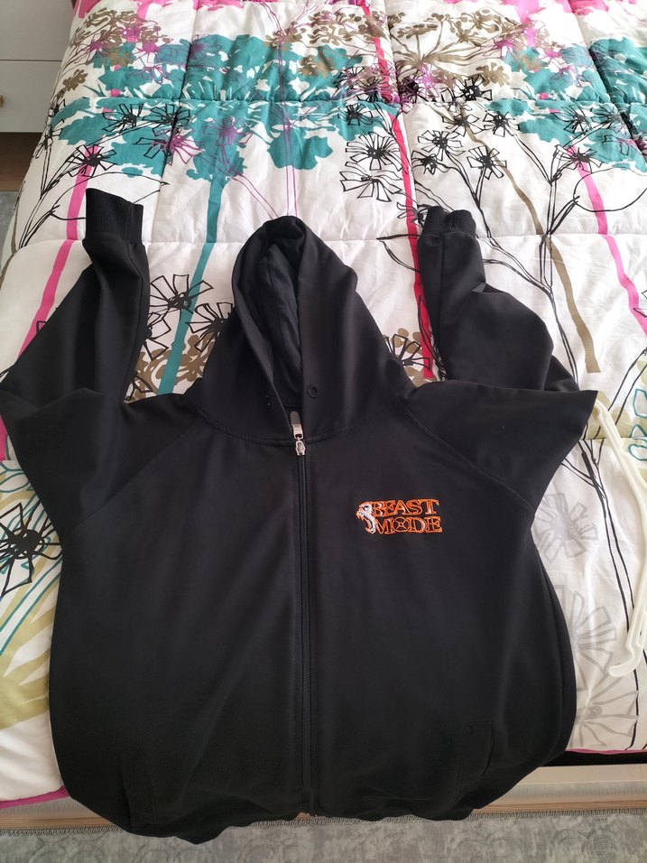 Yumuşak kumaştan, fermuarlı ve kapüşonlu siyah fitted sweatshirt. Uzun kollu ve baskılı, spor ve günlük kullanım için uygundur.