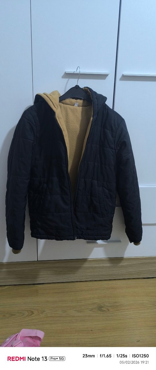 Erkek çocuk için fermuarlı, yakası kesik detaylı, siyah renkli, yumuşak ve sıcak kumaştan yapılmış dar kesim mont.