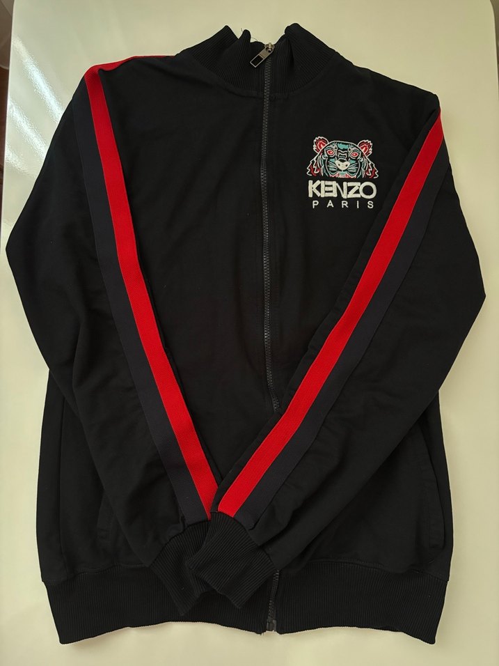 Fermuarlı ve bisiklet yaka olan bu siyah erkek çocuk ceketi, yumuşak kumaştan üretilmiştir. Kollarında kırmızı şeritler ve Kenzo Paris kaplan baskısı vardır.