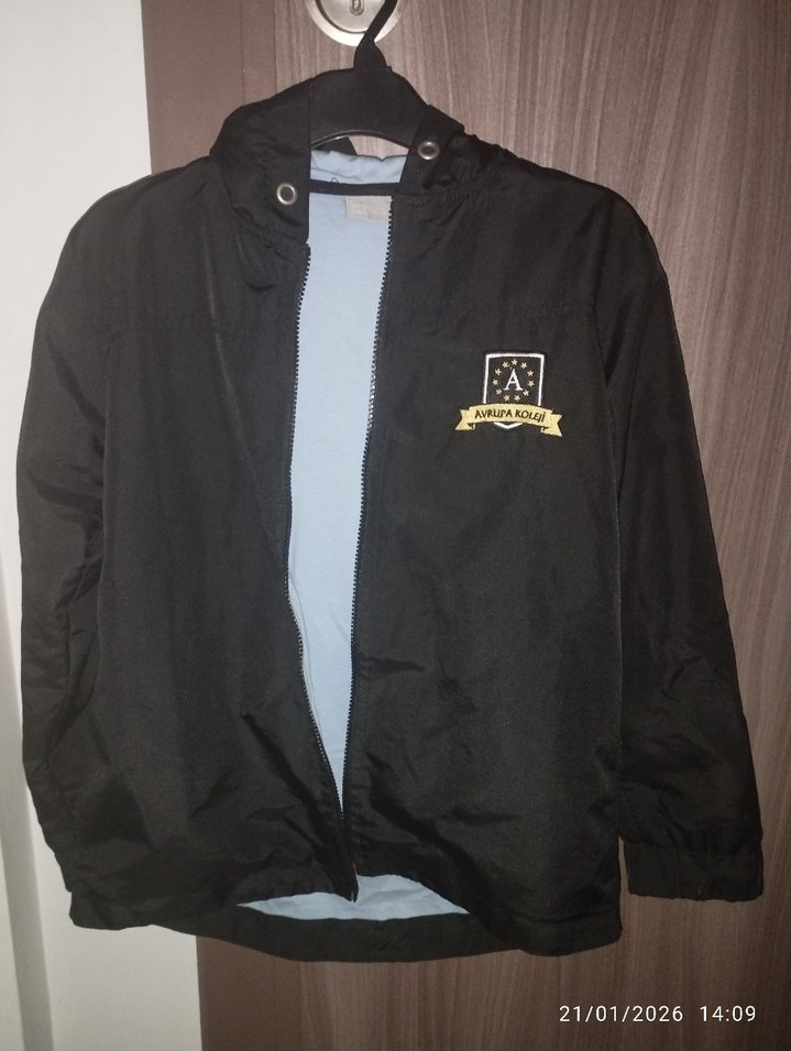 Erkek çocuk için siyah, fermuarlı, notched lapel yakalı, bol kesim ve baskılı desenli yumuşak ve sıcak kumaştan yapılmış ceket.