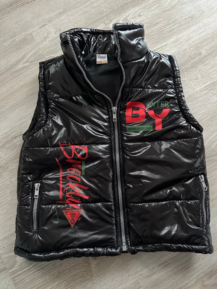 Siyah, fermuarlı, baskılı ve parlak sentetik kumaştan yapılmış, erkek çocuklar için dar kesim kolsuz yelek.