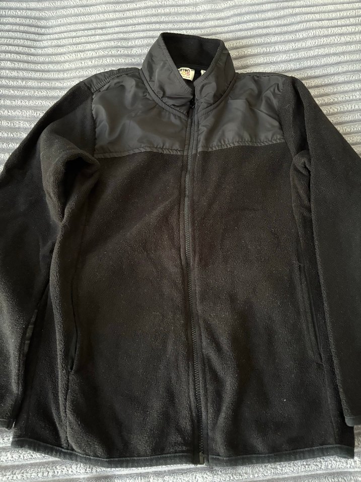 Erkek çocuk siyah polar ceket, fermuarlı ve yüksek yakalıdır. Uzun kollu, vücuda oturan, normal boydadır. Günlük ve sokak stiline uygundur.