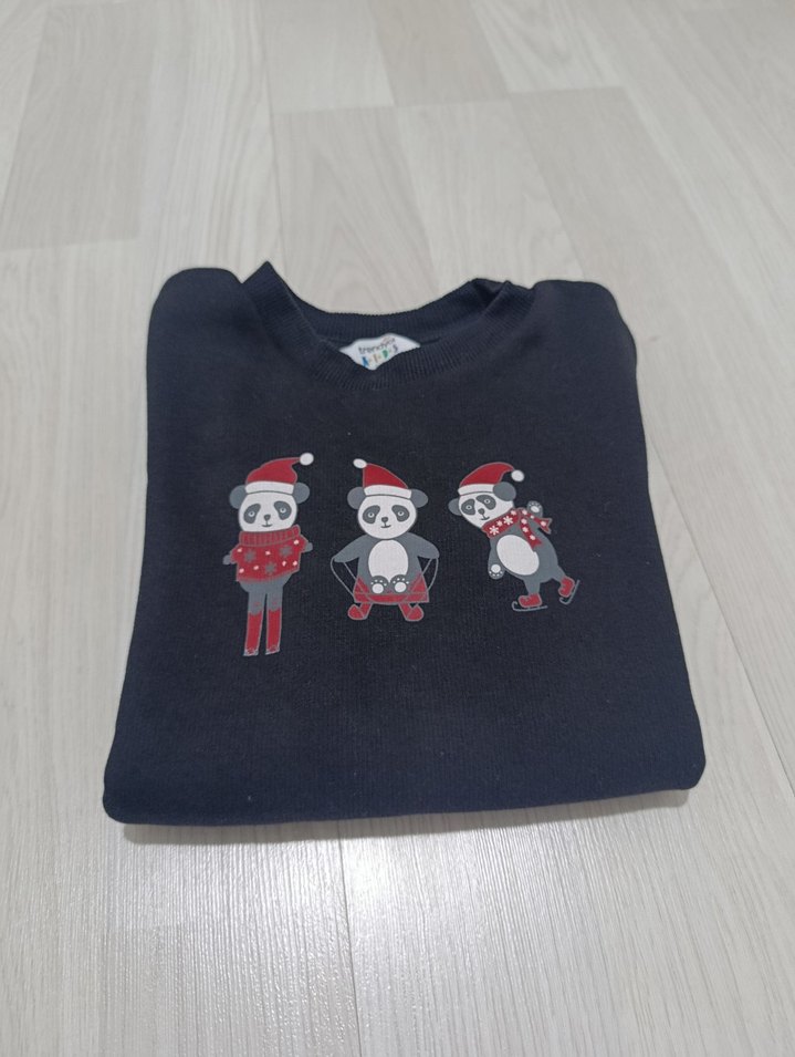 Pamuklu kumaştan yapılmış, bisiklet yaka ve uzun kollu siyah erkek çocuk sweatshirt. Önde Noel şapkalı üç panda baskısı ve rahat kesim bulunur. 9/10 yaş, Trendyol milla marka,solma yok,simsiyah ,bir iki kez giyilmiş, defosuz sweatshirt #defacto#lcw