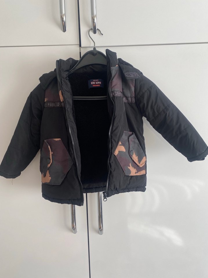Erkek çocuklar için bol kesim, kemerli ve kesik yaka detaylı mont. Siyah ve koyu kamuflaj desenli, yumuşak iç astarlı rahat tasarım.