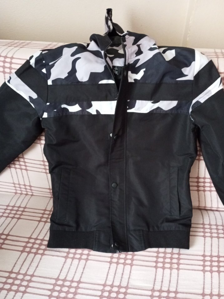 Erkek çocuklar için siyah kamuflaj desenli, düğmeli, yakalı ve dar kesim sentetik kumaştan yapılmış sokak tarzı ceket.