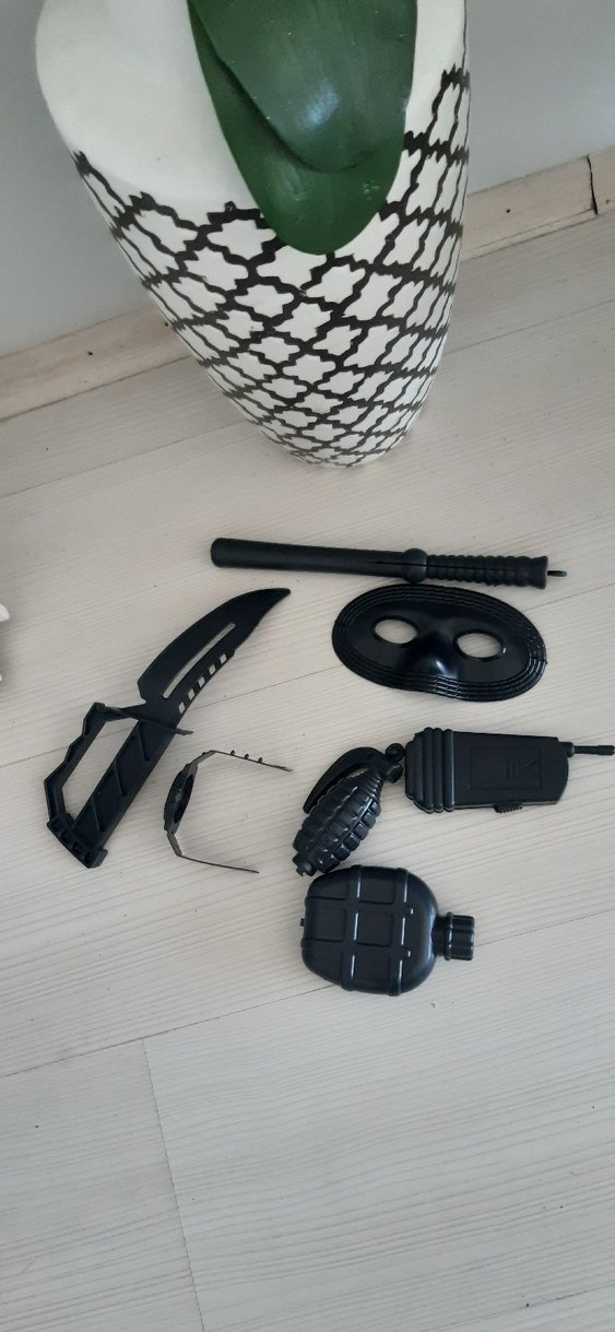 Erkek çocuklar için siyah kamuflaj desenli, tokalı plastik aksesuar seti. Bıçak, cop, maske, el bombası ve matara içerir. hepsi 200
