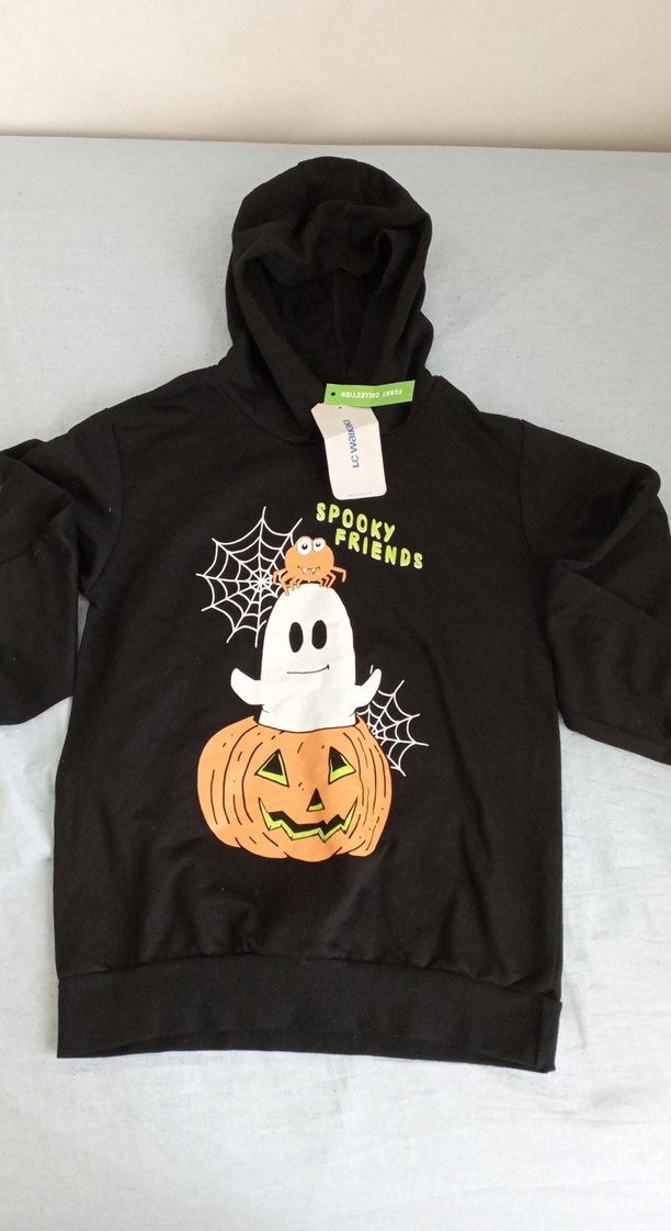 Siyah renkli, kapüşonlu ve uzun, kabarık kollu erkek çocuk sweatshirtü. Yumuşak kumaştan, hayalet ve balkabağı baskılı, 'SPOOKY FRIENDS' yazılı gotik tarzda.