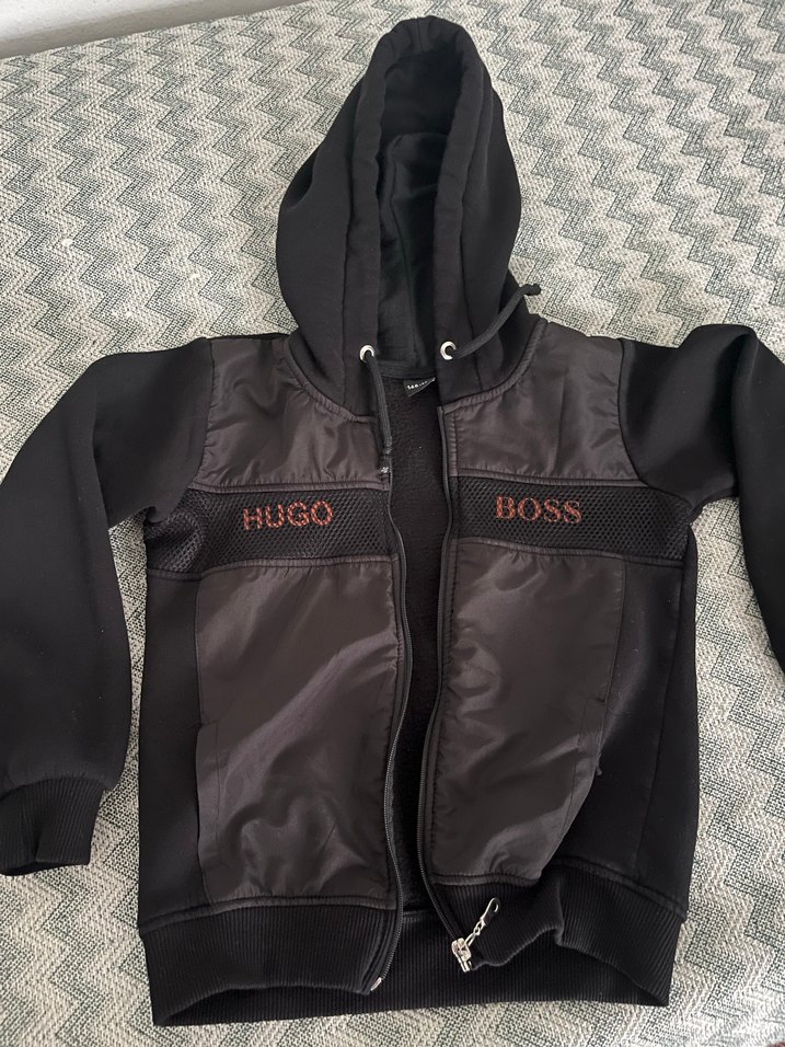Erkek çocuklar için kapüşonlu, fermuarlı ve dar kesim siyah ceket. Yumuşak ve sıcak kumaştan, üzerinde HUGO ve BOSS logolu baskılar bulunur.