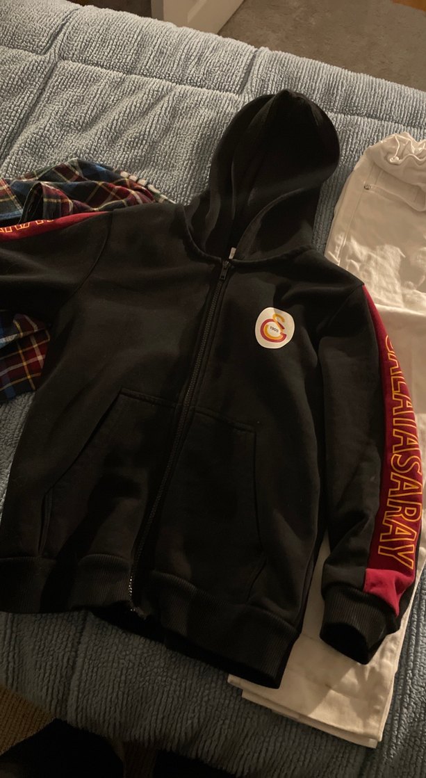 Erkek çocuklar için siyah, kapüşonlu, fermuarlı ve baskılı kollu dar kesim ceket. Yumuşak ve sıcak kumaştan, günlük sokak tarzı için uygundur.